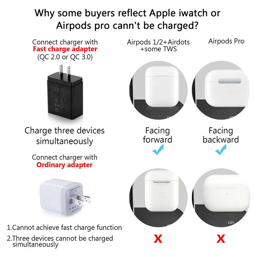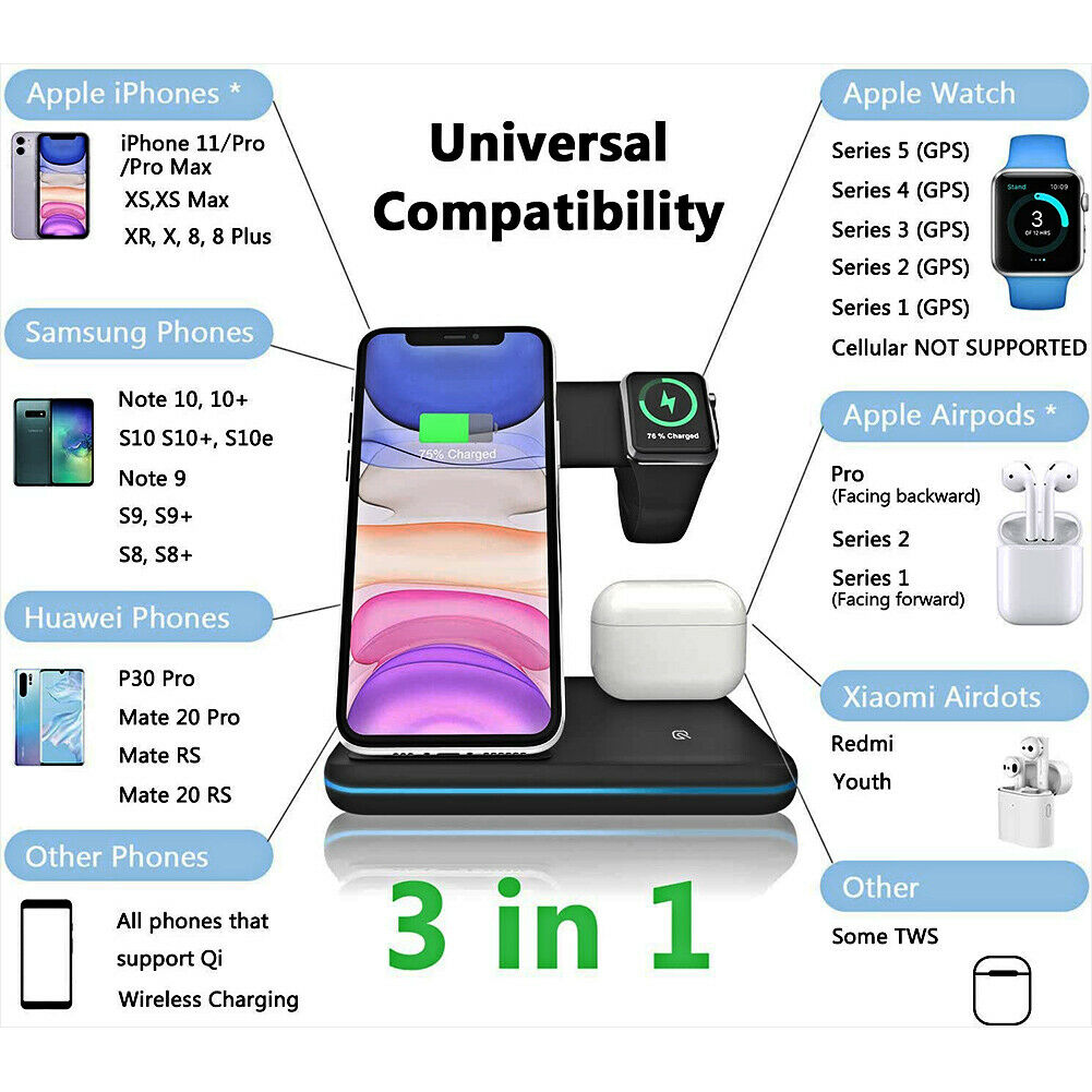 7.5W wireless charging compatible with iPhone 11 / 11 Pro / 11 Pro Max / XS Max / XS / XR / X / 8 / 8 Plus; 15W fast wireless charging compatible with Samsung Galaxy S10 / S9 / Note 10 / Note 9, and other support Qi’s mobile phone’s standard charging. Applicable to Apple Watch Series 4/3/2/1 and AirPods.