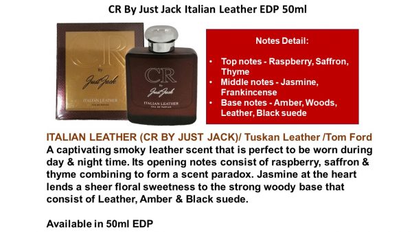 - ITALIAN LEATHER (CR BY JUST JACK)/ Tuskan Leather /Tom FordA captivating smoky leather scent that is perfect to be worn during day & night time. Its opening notes consist of raspberry, saffron & thyme combining to form a scent paradox. Jasmine at the heart lends a sheer floral sweetness to the strong woody base that consist of Leather, Amber & Black suede. Available in 50ml EDP
